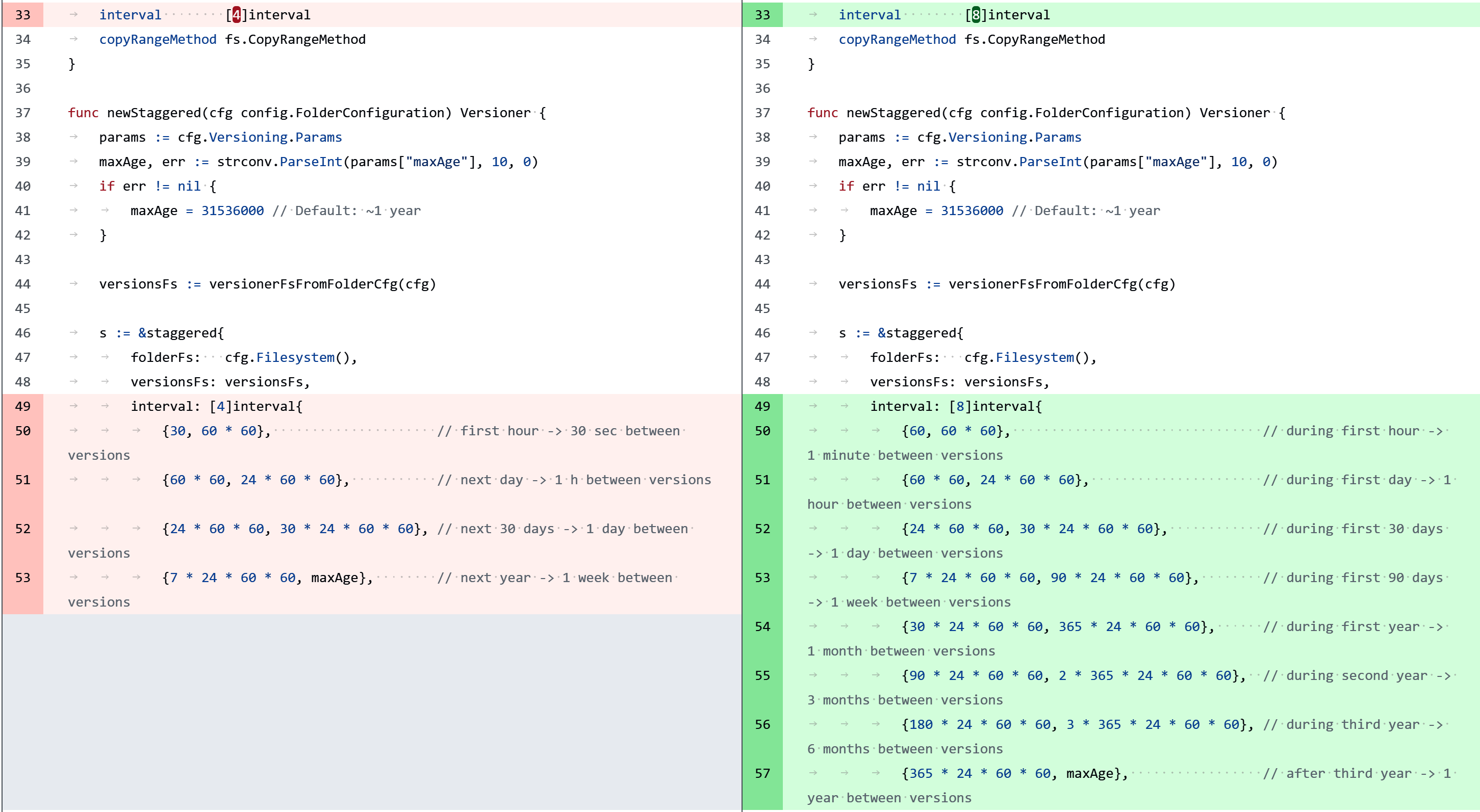I like the idea of staggered file versioning - that is, keeping time-based increments of my files, constrained by time intervals rather than just an arbitrary number. However, I find it’s currently way too aggressive by default. For the first hour, a version is kept for every 30 seconds; for the first day, a version is kept every hour, and so on. I have a single 90 MB file that gets written to very frequently, and so within a day it’s already ballooned to 2.7 GB.