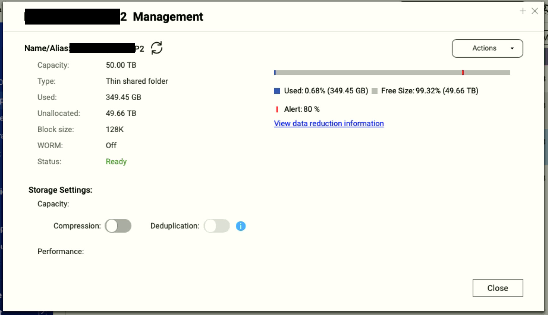 …And here’s what I’m seeing on the Qnap for the overall storage pool and the shared folder: