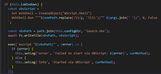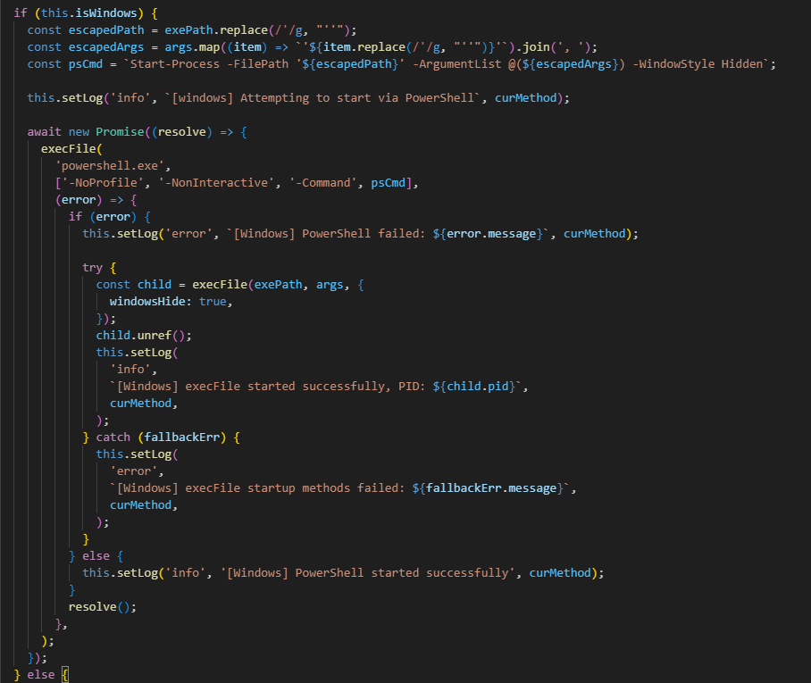 Hmm… My current approach uses the execFile module in Node.js, with PowerShell specified as the launcher to execute the command for starting the Syncthing service. This ensures that my project’s process is completely detached from Syncthing’s process while also preventing the Syncthing console from appearing. If even PowerShell fails, there is a fallback mechanism using execFile to directly launch Syncthing. Although this would link the processes, it ultimately meets the requirement of enabling Syncthing via Node.js without displaying a console window.Here is the code: