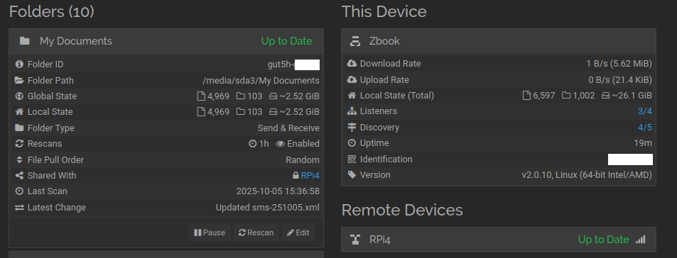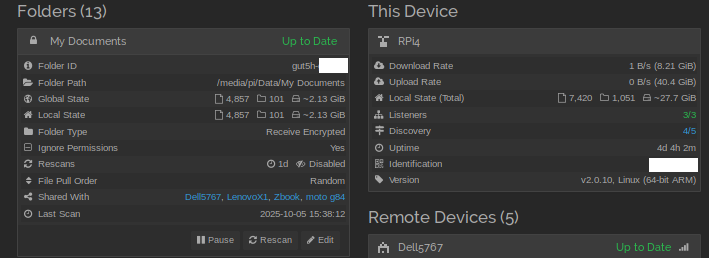 RPi4 (hub) with several encrypted folders shared with three non-encrypted laptops (spokes) running Ubuntu 25.04. All devices are updated regularly and all have ST 2.0.10.
