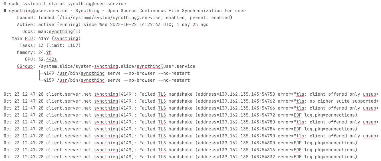 Oct 23 10:07:53 client.provider.net syncthing[4149]: Failed TLS handshake (address=FFF.FF.FFF.FFF:46760 error="read tcp XX.XXX.XXX.XX:22000->1>