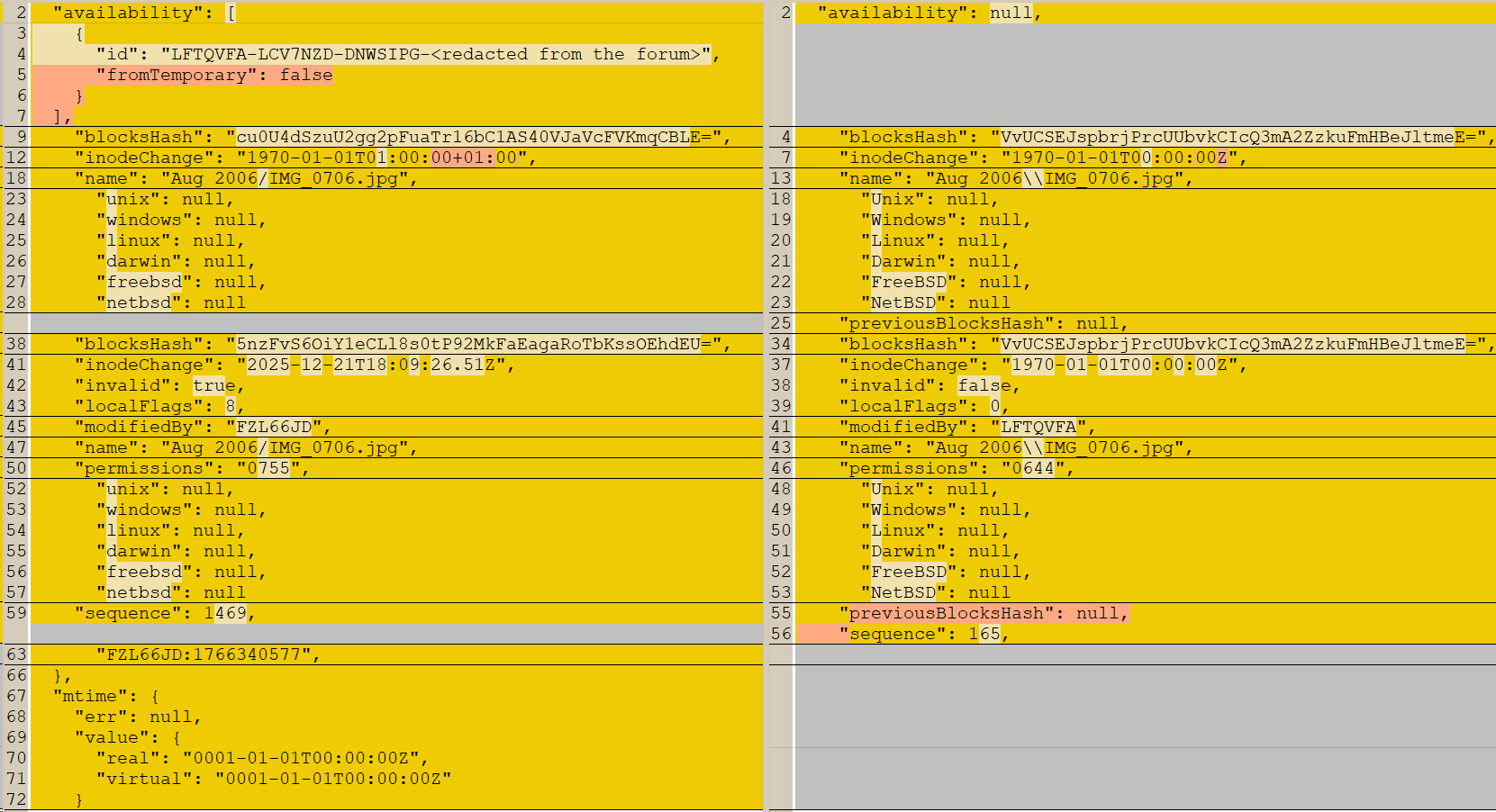 What I found is that once I set up the folder, it is reporting that two-thirds of the files are ‘locally modified’ on the receive-only side. Yet I know the files are a perfect match, having checked the hashes and creation/modification dates. Even the log files seem to indicate that the files match, since the log contains an “unchanged:” line for each file, which the source code in walk.go suggests the files actually matched.