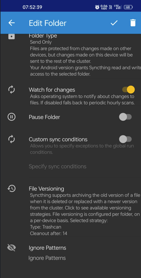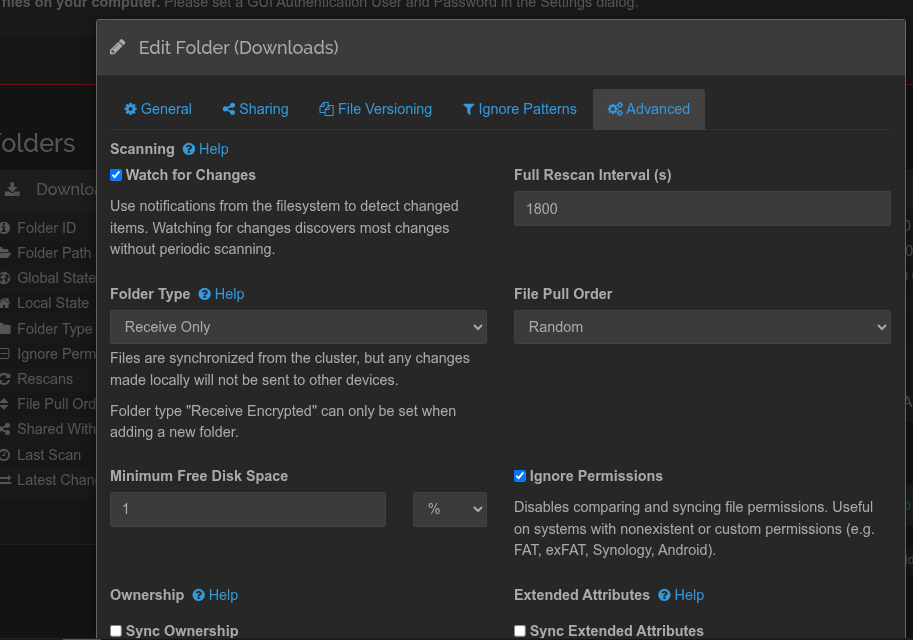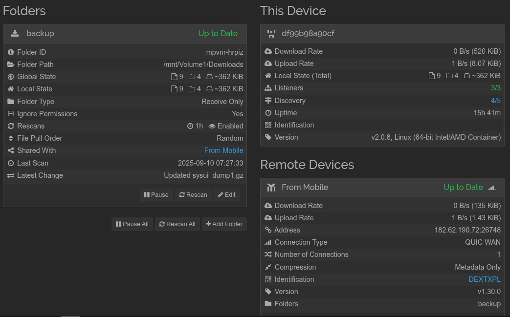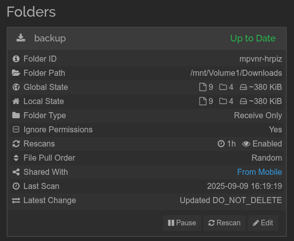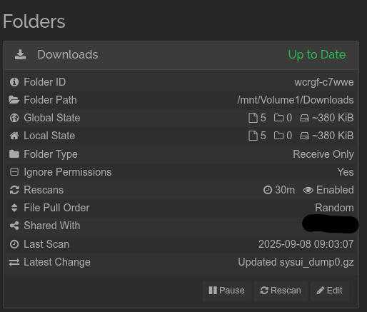 I put the shared path in syncthing like this “/mnt/Volume1/Downloads” not sure correct or not. I also tick the “ignore permission” in the advance setting