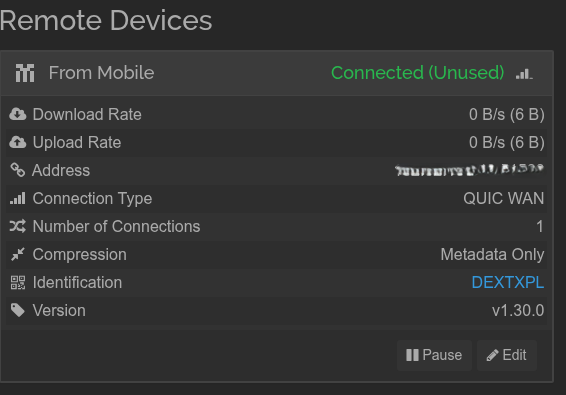 The status “Connected (Unused)” and the lack of seeing any shared Folders on the Remote Device indicates that the two Syncthing Devices are peers but are not sharing any Folders between them. I recommend that you unshare the Folder and reshare it as your next troubleshooting step.