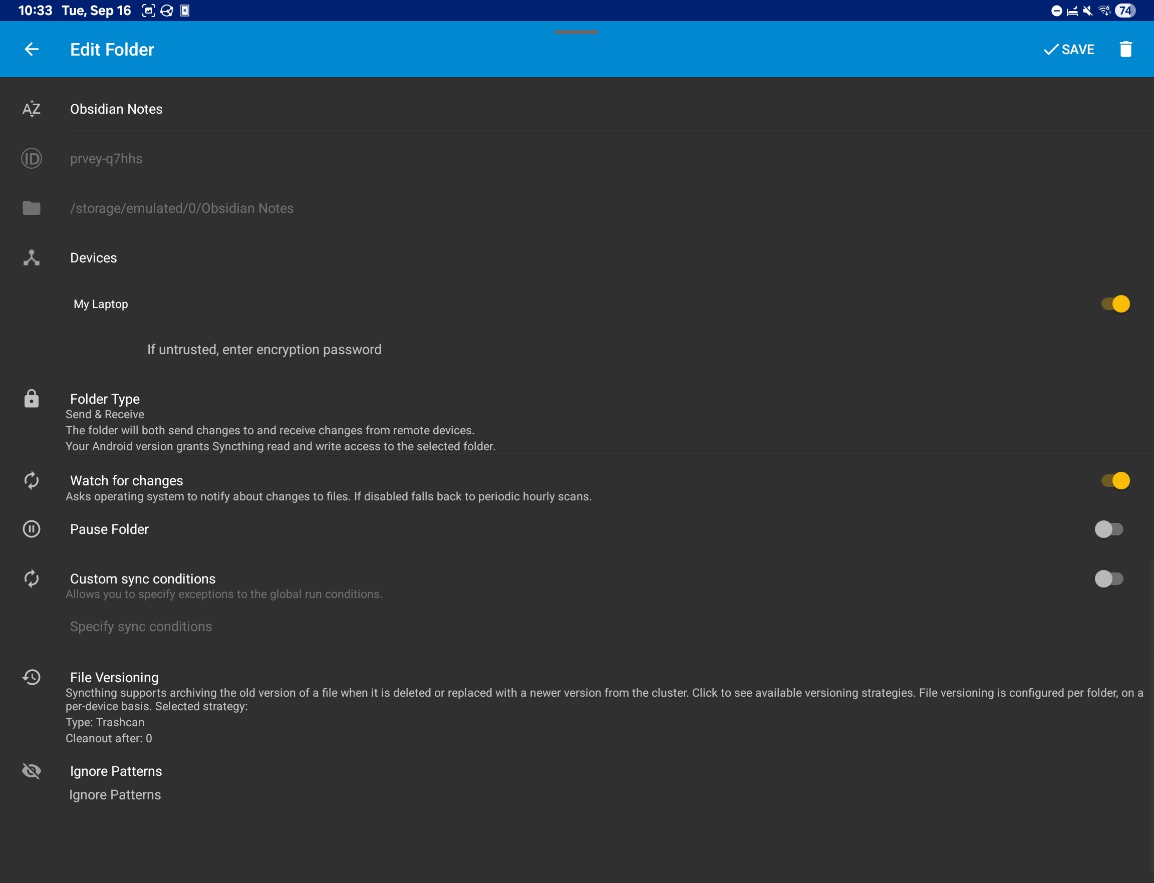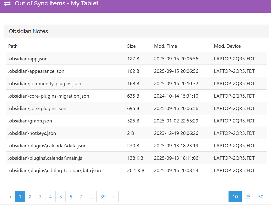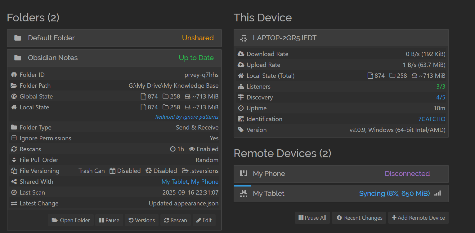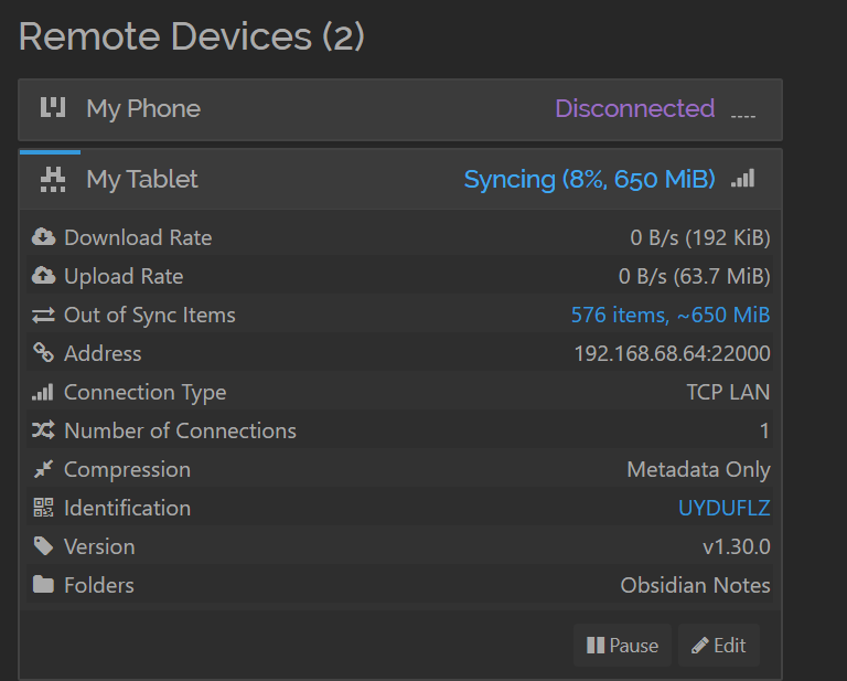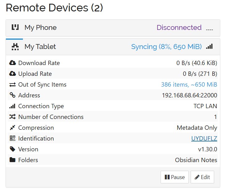 I was able to sync the folder with my phone after solving the “missing folder path error”, but when I tried to sync it with my tablet, it didn’t work. Every time I tried to sync it, it will start syncing at first, but then the download and upload rates will lower to 0, and the syncing will stop. Each time it stopped at a different percentage (76%,5%,8%). I have inserted below screenshots from my tablet and laptop. Thanks in advance for the help.
