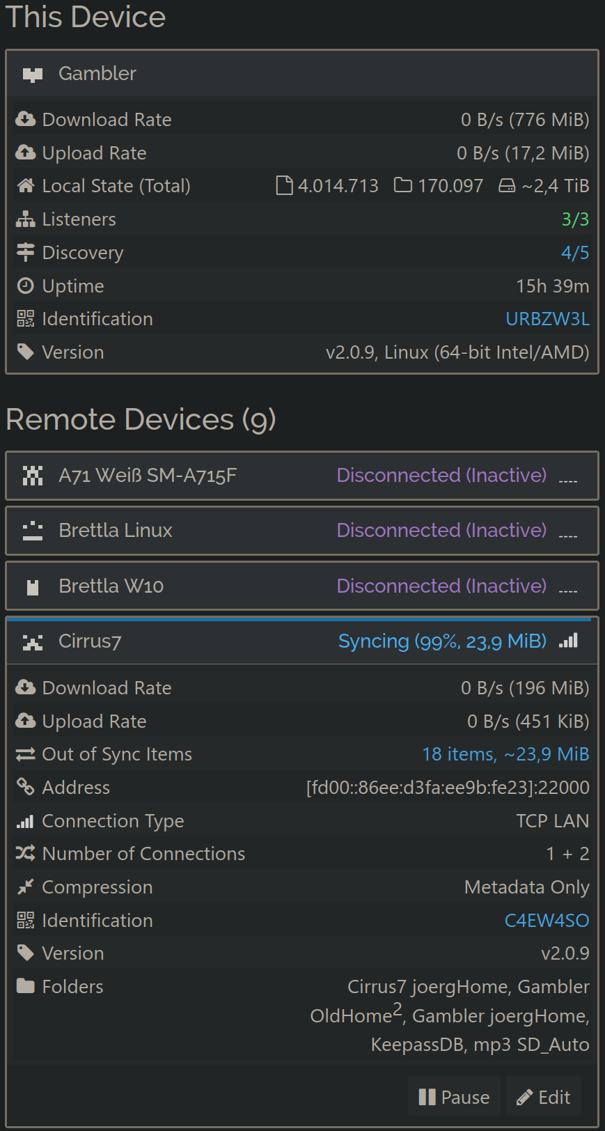 After selecting all red buttons i.e. “Revert Local Changes” there is only the “Syncing (99%, 23,9MiB” indication (18 items) in “Remote Devices” instead of “Up to Date” which is only flickering from time to time. The files list window on the “items” link does not show any of these files, while all transfer rates are 0, 1 or 2 B/s: