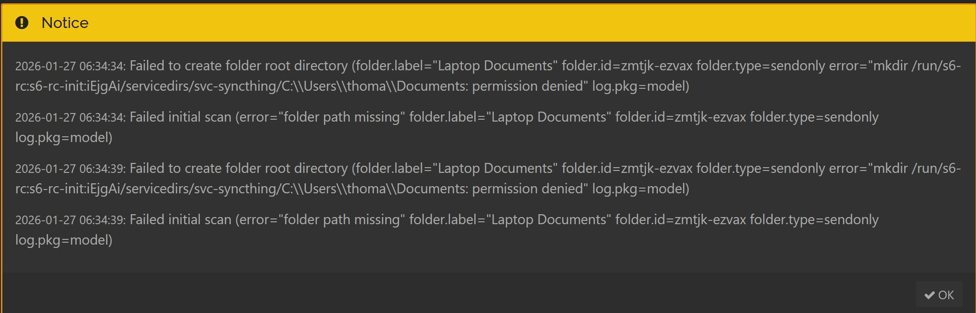 2026-01-27 11:04:47: Failed initial scan (error=“folder path missing” folder.label=DXP2800_Documents folder.id=ffplv-ufuq6 folder.type=sendreceive log.pkg=model)