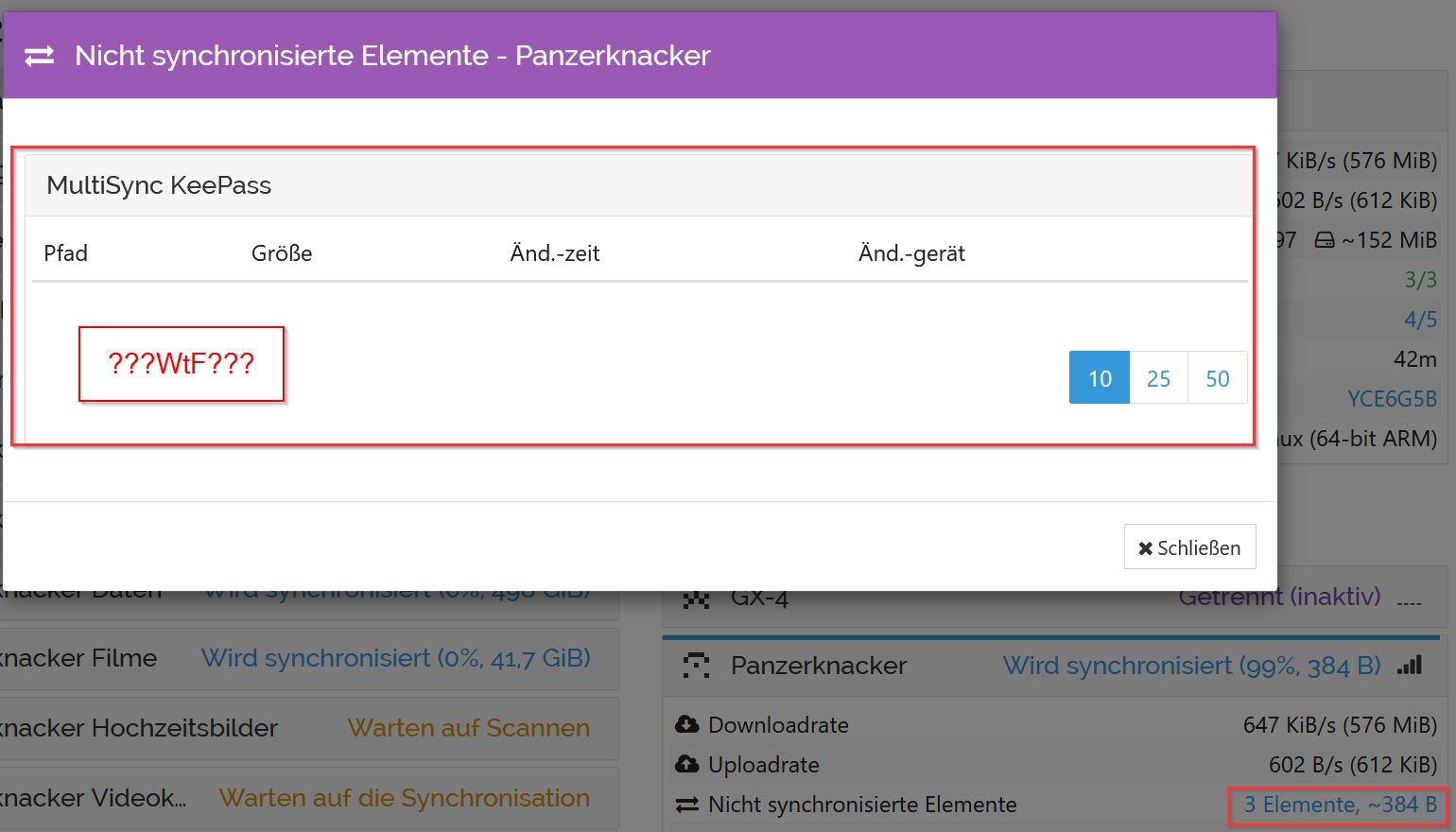 I see a strange effect: In this example there are three files displayed as unsynchronized (but in fact never will be synchronized, the progress keeps being frozen at 99%!), clicking on them only shows an empty list: