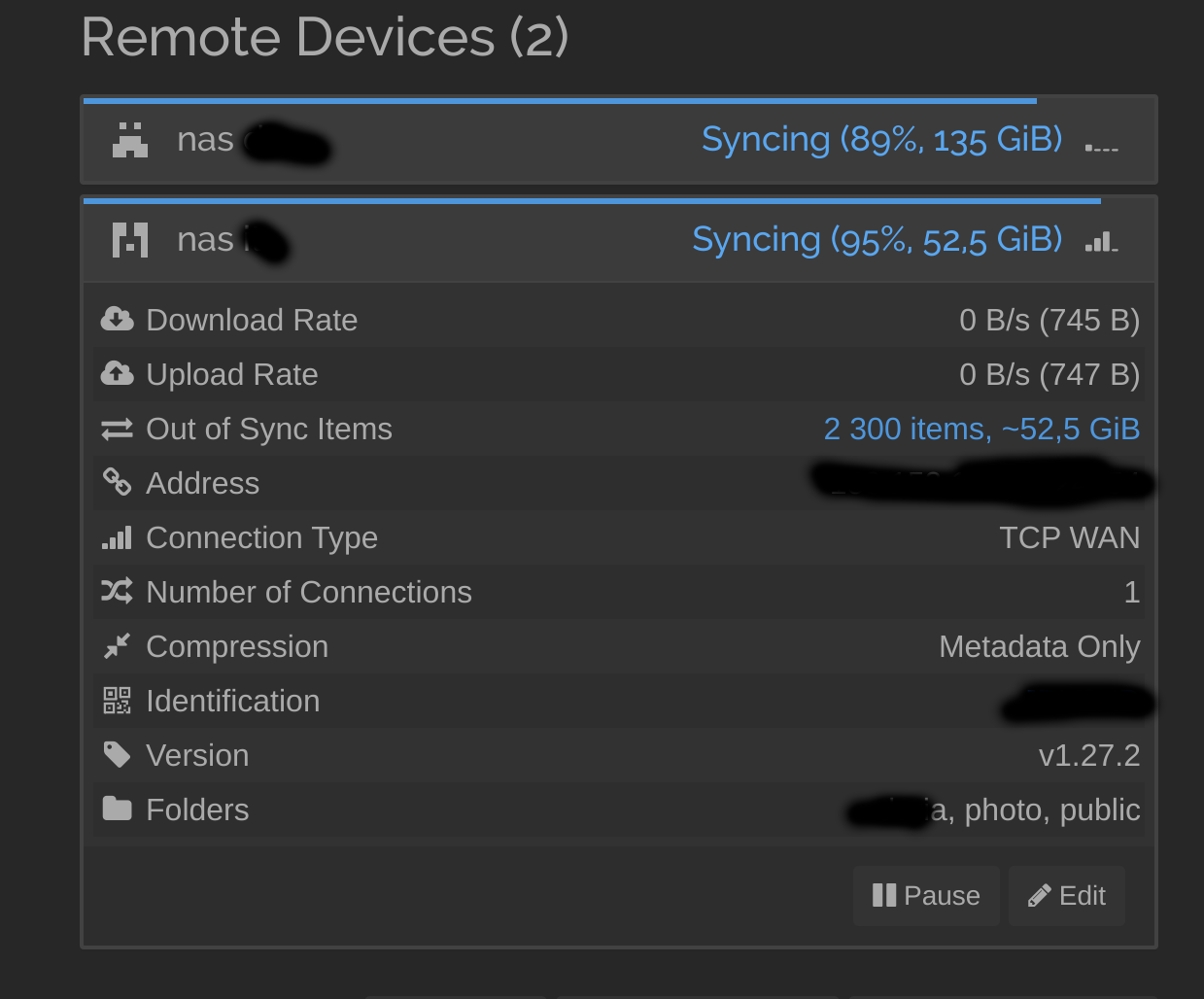 I have 3 synology devices with syncthing. On one of device I see non-synhronised elements in list of connected devices. But on another two all nodes shown synchninised.