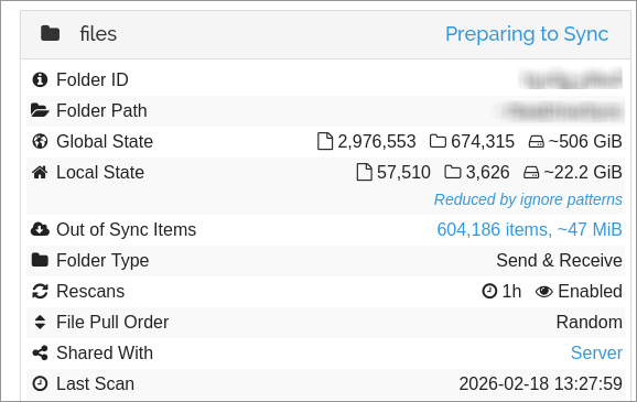 As you can see from the above screenshot, the shared folder is pretty huge, but only a small subset is shared (via ignore patterns). You can also see that “Out of Sync” display does not make sense, because it’s much larger than the total local state (and no, 600k files were not added since last sync). The other side is a server, running Syncthing docker image and running 24/7 (so it’s always on and thus always scanned). Devices are on the same local network. Database of both devices is on the SSD (but the Server’s data is on the HDD). This started happening after update to the Syncthing 2 (I do not remember it ever happening before). This is running Syncthing 2.0.13 on Arch Linux.