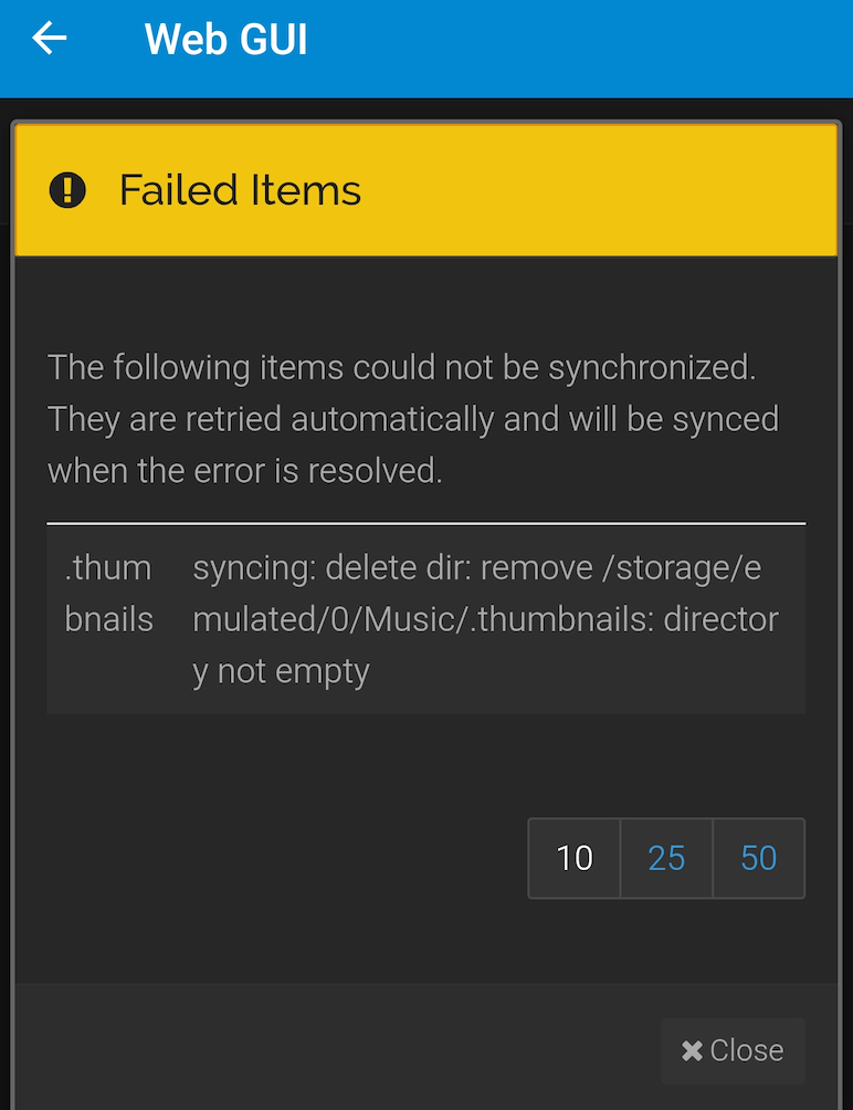 Funny I selected âoverride changesâ on laptop. Now laptop shows as âup to dateâ and syncthing-fork android shows as âout of syncâ with 1 file .thumbnails