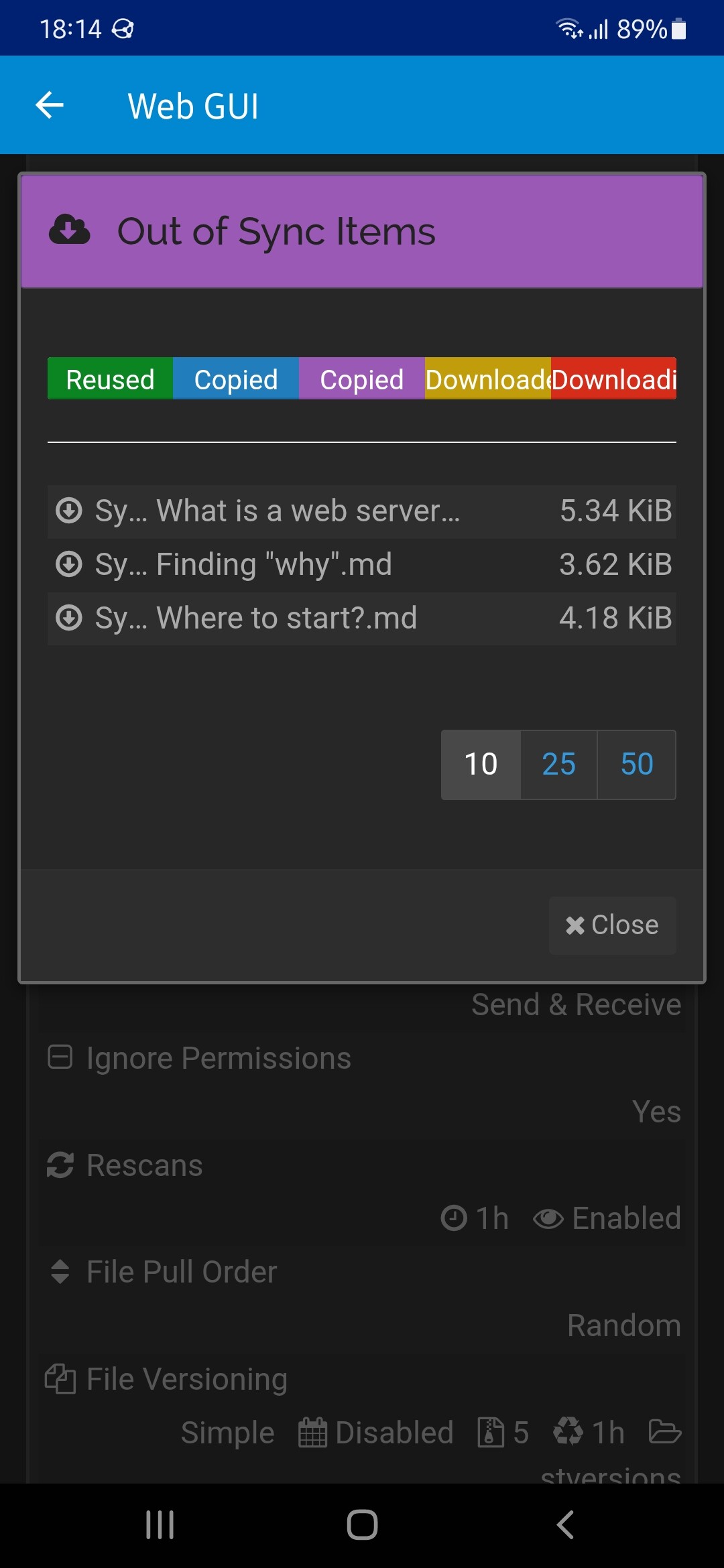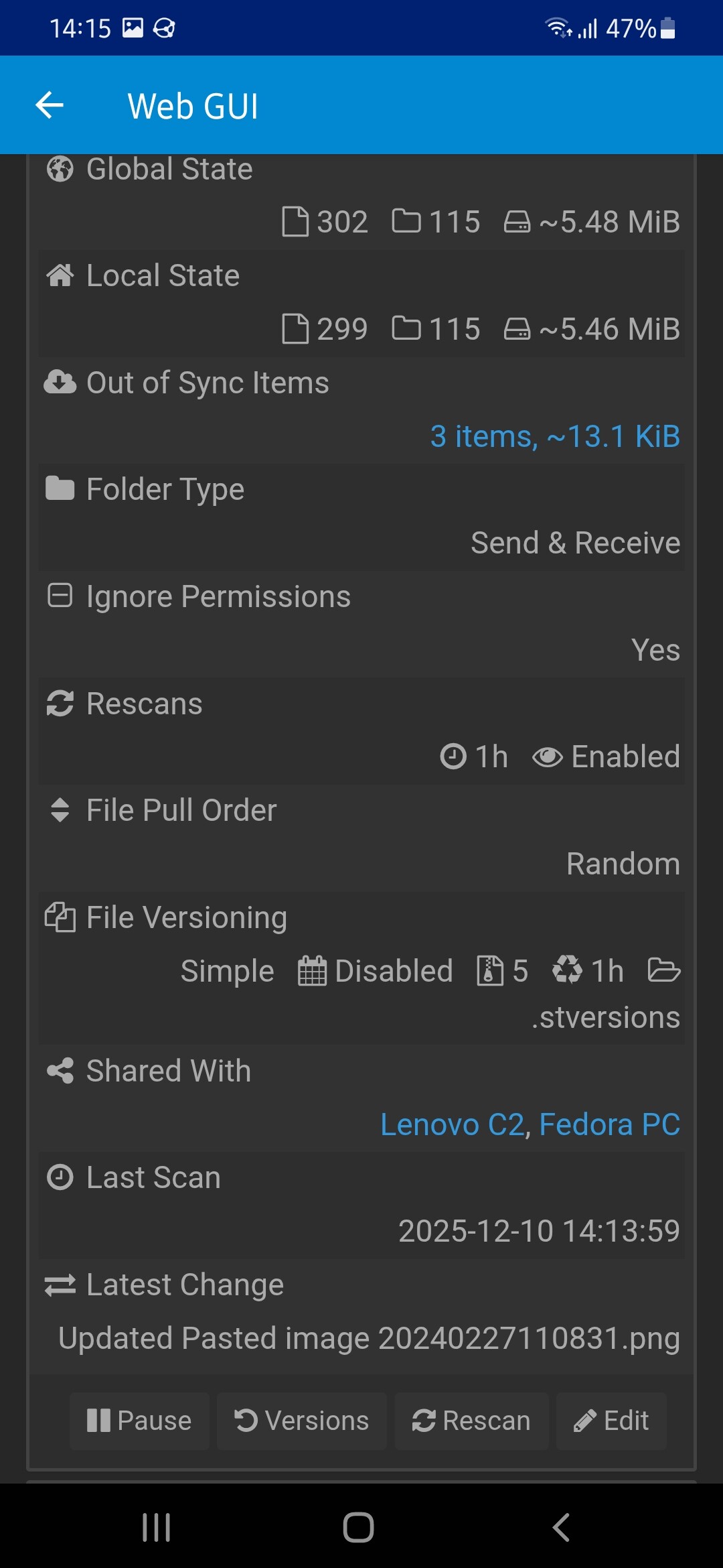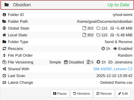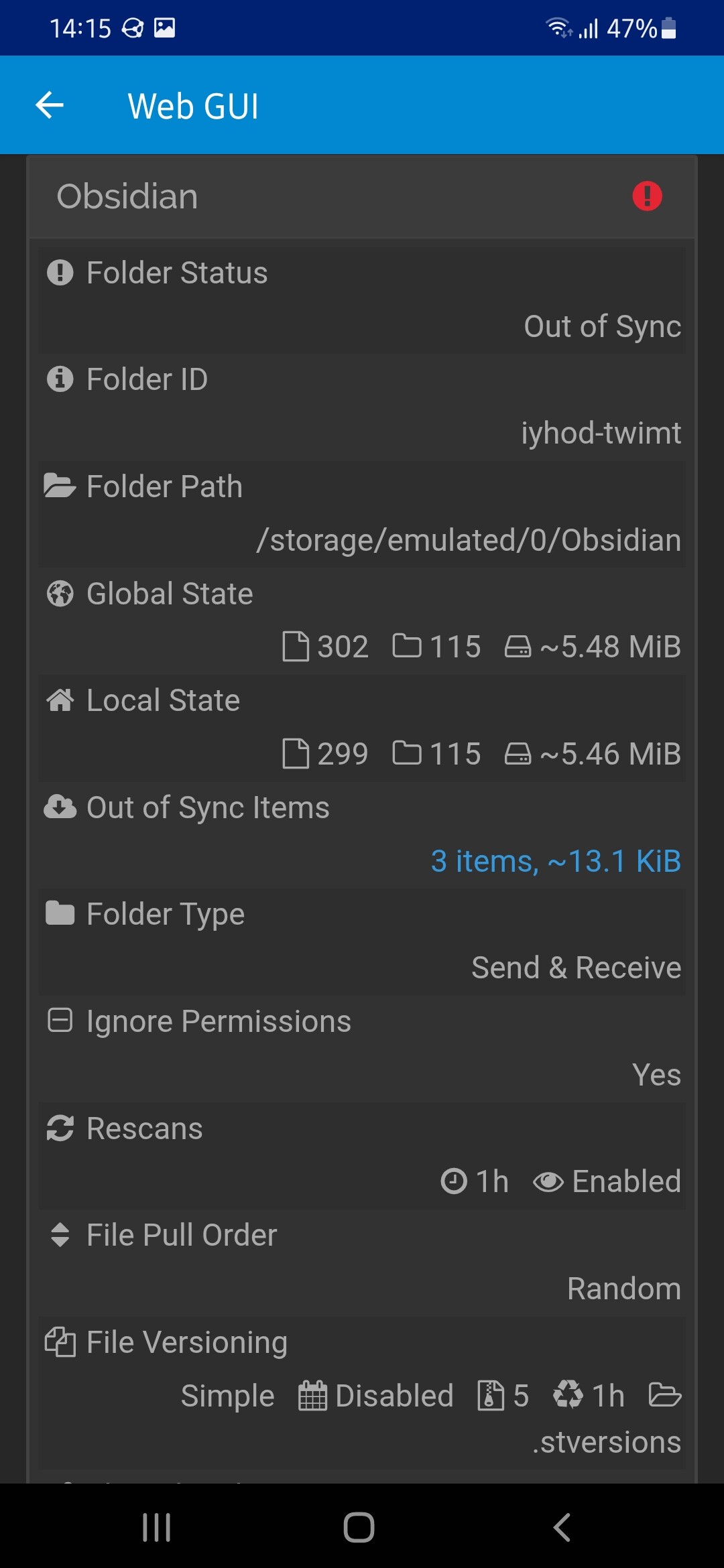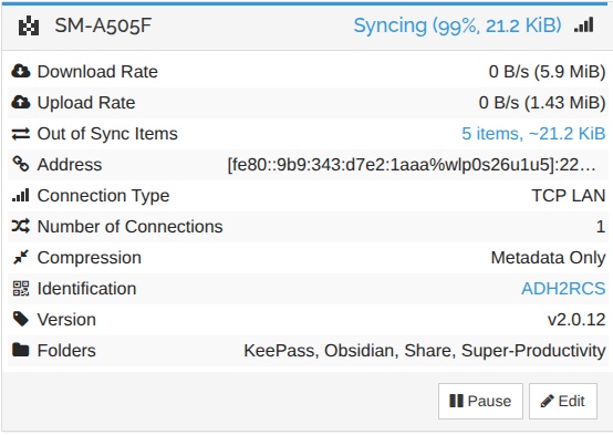 Hello There, I use syncthing for syncing my notes across my devices, However I recently bought a new android, When I try to share my notes on it I find them out of sync (even if I delete the entire folder and resync from the start, It still gets out of the sync). I have checked there are no conflicts in files. This is odd because I also share the same folder with another android phone and it has no problems with it.
