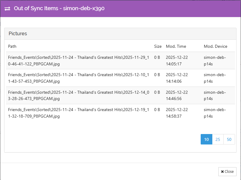No amount of restarting SyncThing (on all of the devices), rescanning the Pictures folder, or getting all the nodes up and running at the same time has kicked off the synchronization of these last few files. I can’t see the file names in the log on simon-ws-rl, should I be looking somewhere else for error messages? The only thing I can see is that the file size is apparently 0 according to SyncThing on the nodes that refuse to sync - not so on the nodes that have synced successfully, such as the following:
