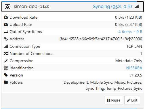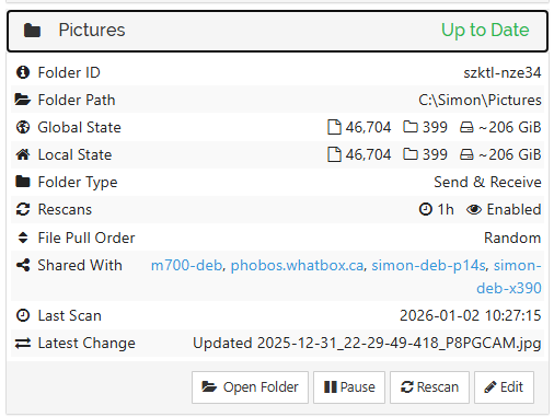 My main photo library is sync’d between a few of my devices: Three Debian devices running SyncThing v1.29.5, v1.29.5 and v1.19.2-ds1 respectively, and one Windows device running v2.0.12 via SyncTrayzor. In addition it also syncs to an off-site server running v2.0.12 on an unspecified Linux build.