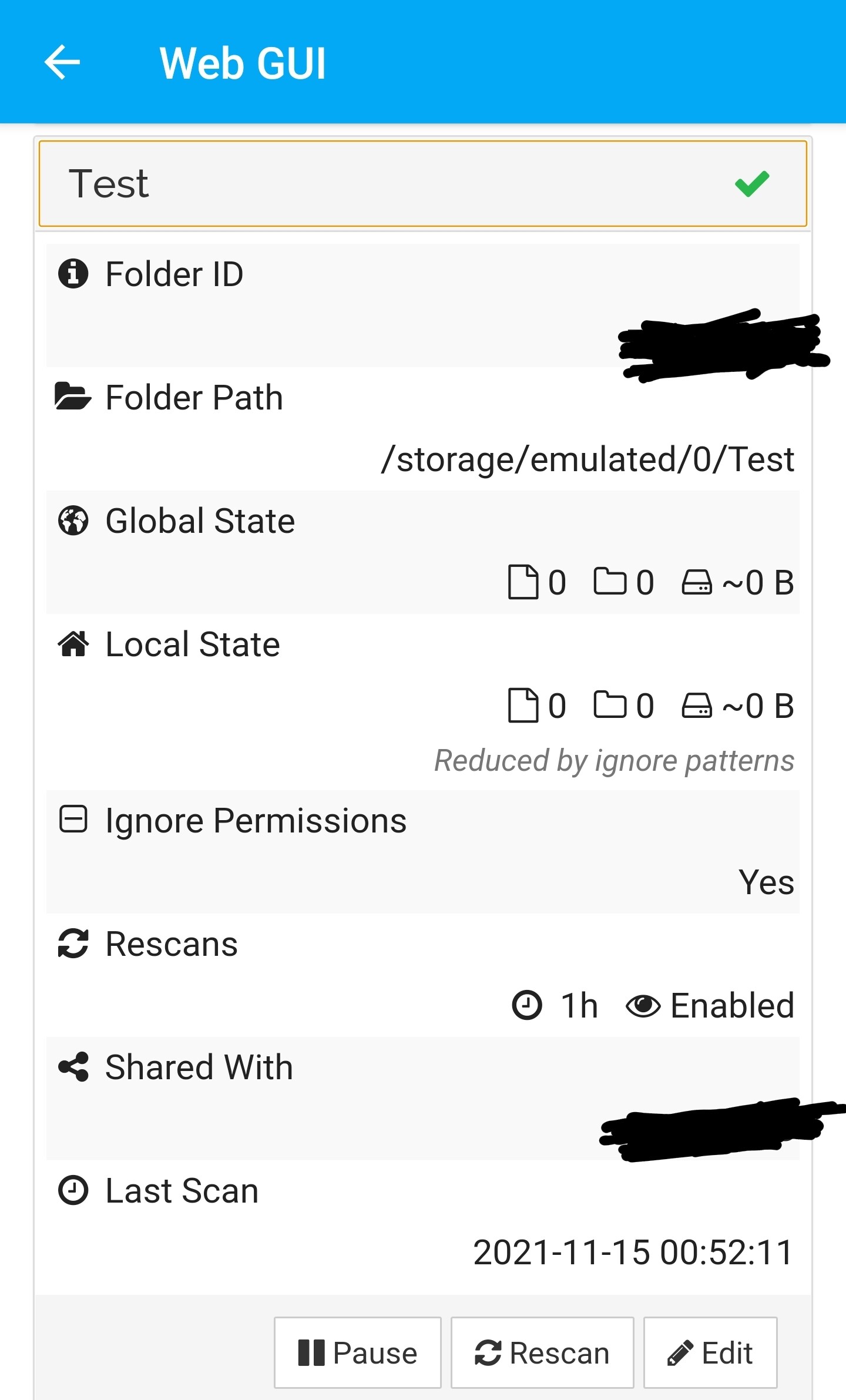 Yeah, I’ve got a feeling something isn’t right there. Can you open the Web GUI on Android using the left slide-out menu, then go to “Edit Folder” there and see what the ignore patterns look like?