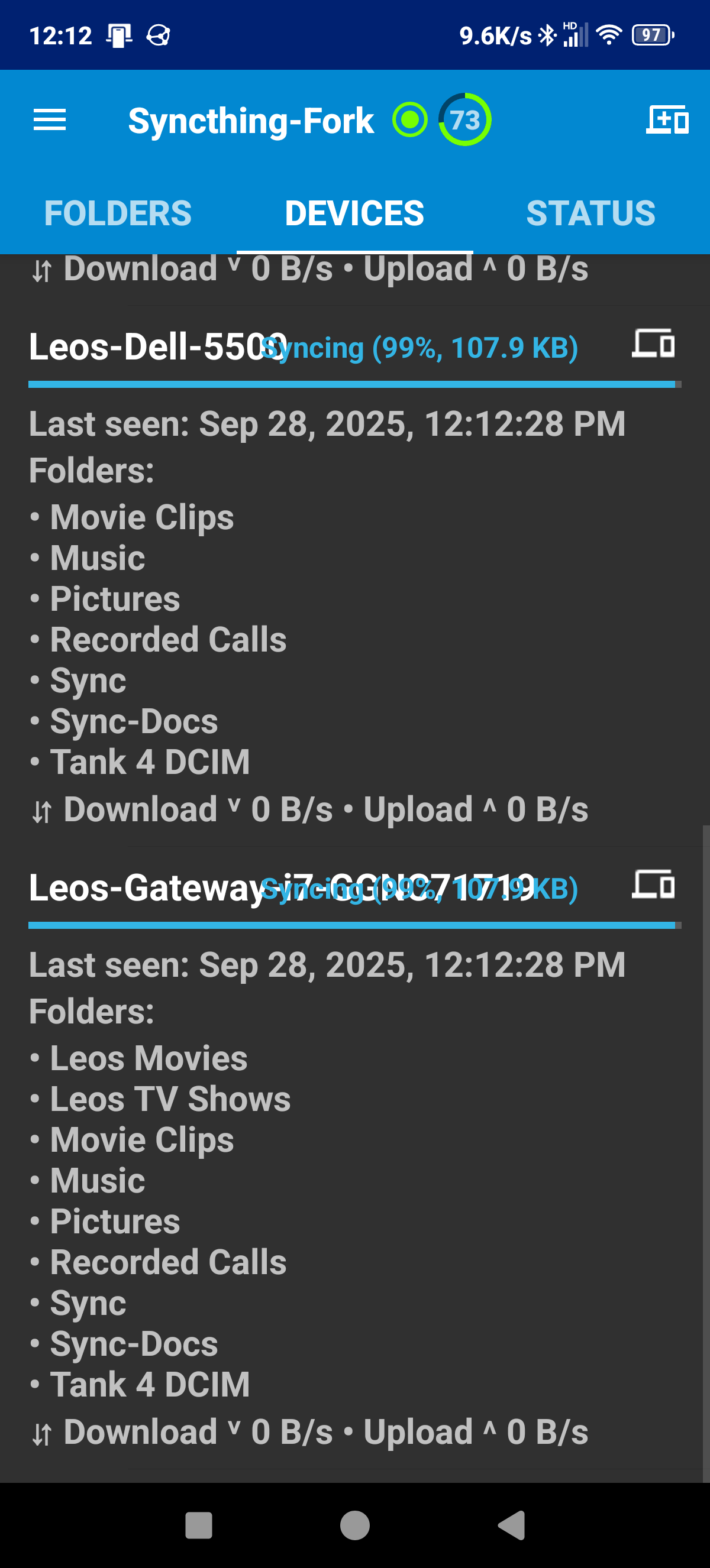 Right Now, My Dell Shows ‘Up to Date’ fully synced. However in the Gateway Laptop, it shows the Galaxy Note stuck at 99% with 2 files, the Tank 4 Phone stuck at 99$ with 1 file, and the Dell at 1% with 117GB to sync, however, if I go to the Dell it shows up to date and has all the files.