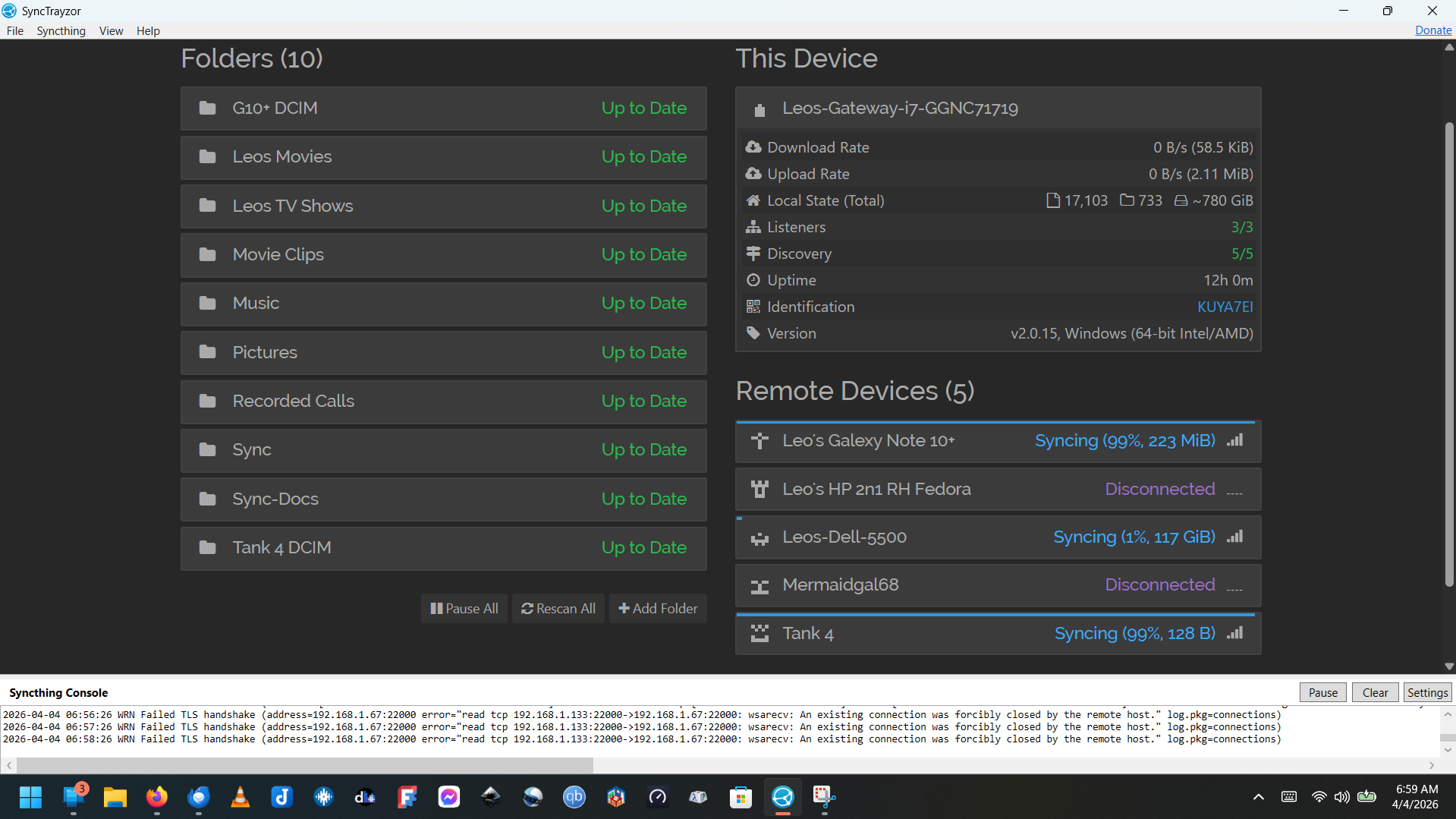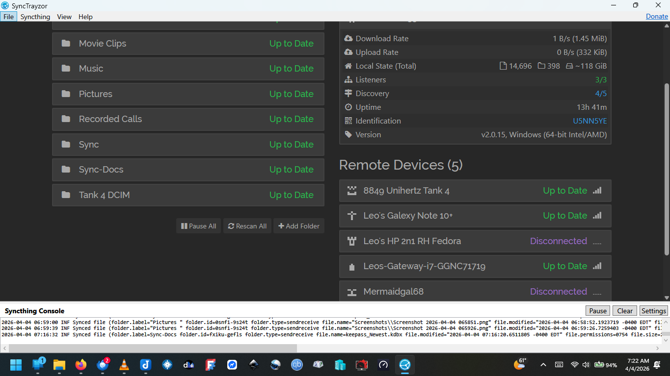 My Syncthing system consists of 6 devices. 1. Tank 4 Android Phone, 2. My Gateway Laptop (Win11H), 3. My Dell Laptop (win11Pro), 4. My HP Linux Laptop (Redhat Fedora 42) 5. Another HP Laptop (Win11H), and an old phone 6. Galaxy 10 Android Phone. There are a total of 9 folders shared with the various devices. All my Windows devices use synctrazor, and the Tank 4 Android Phone says ‘Syncthing-Fork.’