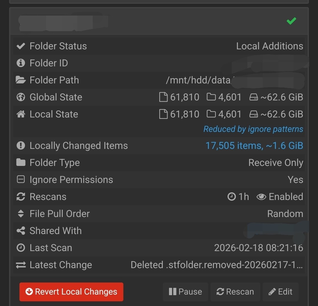 I have a laptop with a directory, that is identical to the directory on the debian server/NAS on a ZFS dataset with atime=off (they both have been robocopied/rsynced from the same external HDD). I’ve wanted to use syncthing to send any changes on the laptop to the NAS, as a backup solution (combined with automatic ZFS snapshots and offsite replication). I’ve run into a problem, in which the NAS-side syncthing shows Local additions for some of the files (some of them haven’t been touched since 2006). I’ve checked the checksum and the modification dates, and they are all the same, and I have ignore permissions set on both devices. If I click Revert Local Changes, the local additions start decreasing and out of sync starts increasing, and after Preparing to sync it quickly scans and shows the same local changes again infinitely, no matter if the laptop is online or offline.