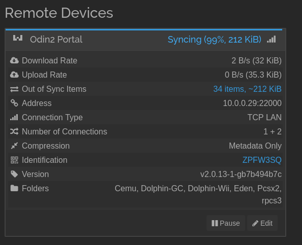 I’ve got rpcs3 and aps3e syncing the saves and trophy folders between my cachyos pc and odin 2 portal handheld. the upload from the odin is getting stuck at 99%. I’m syncing other folders including one from /android/data and they work fine.