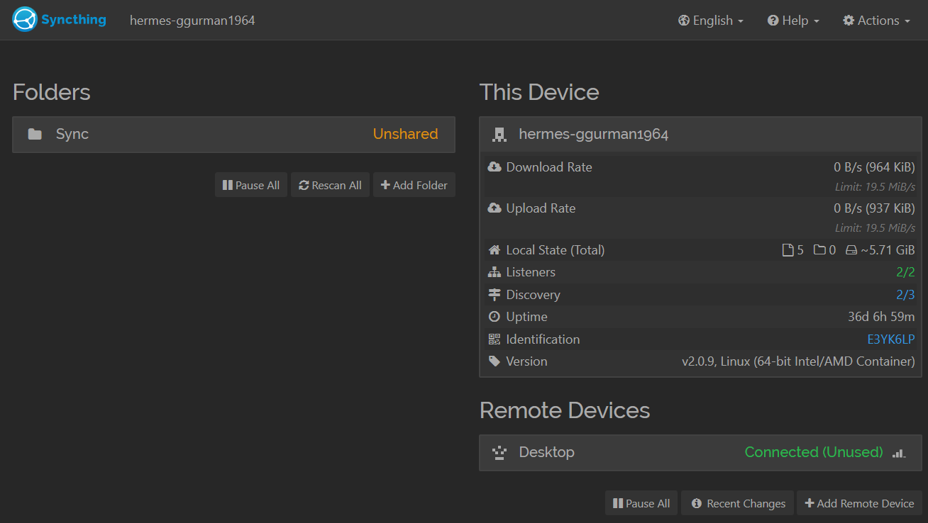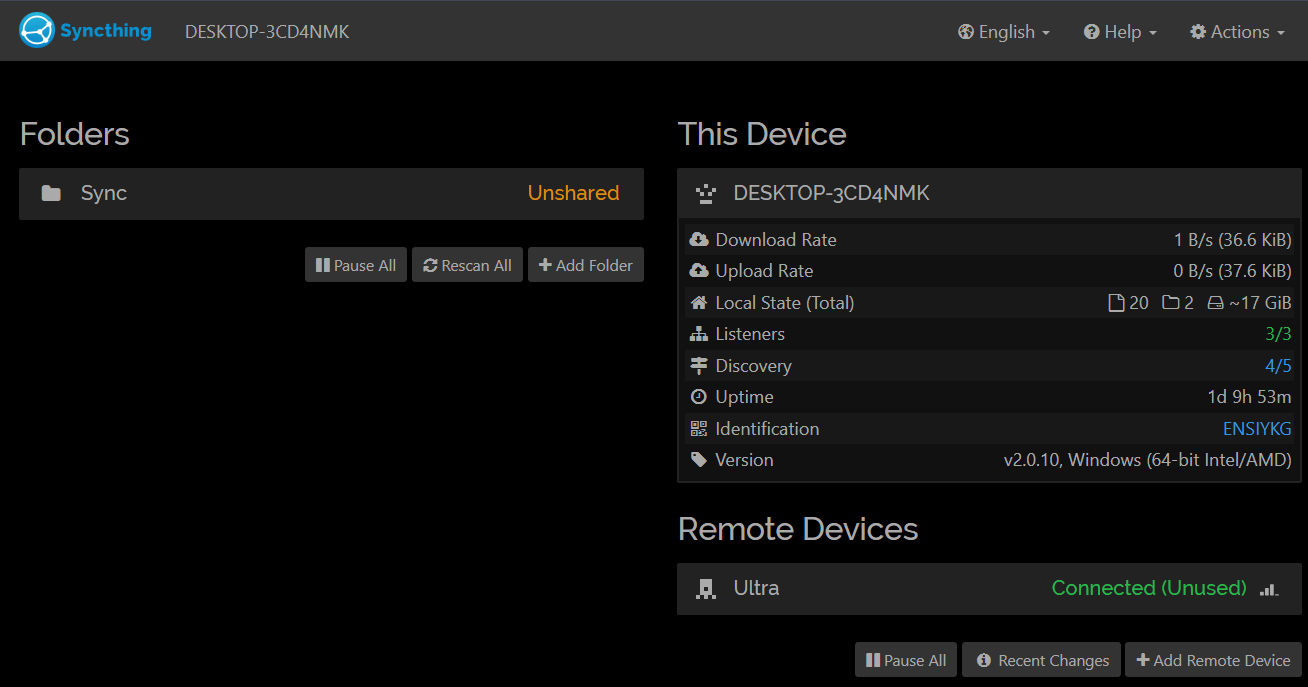 I feel like I must have missed a step but I don’t know what that is. Here are what the Syncthing screens look like: