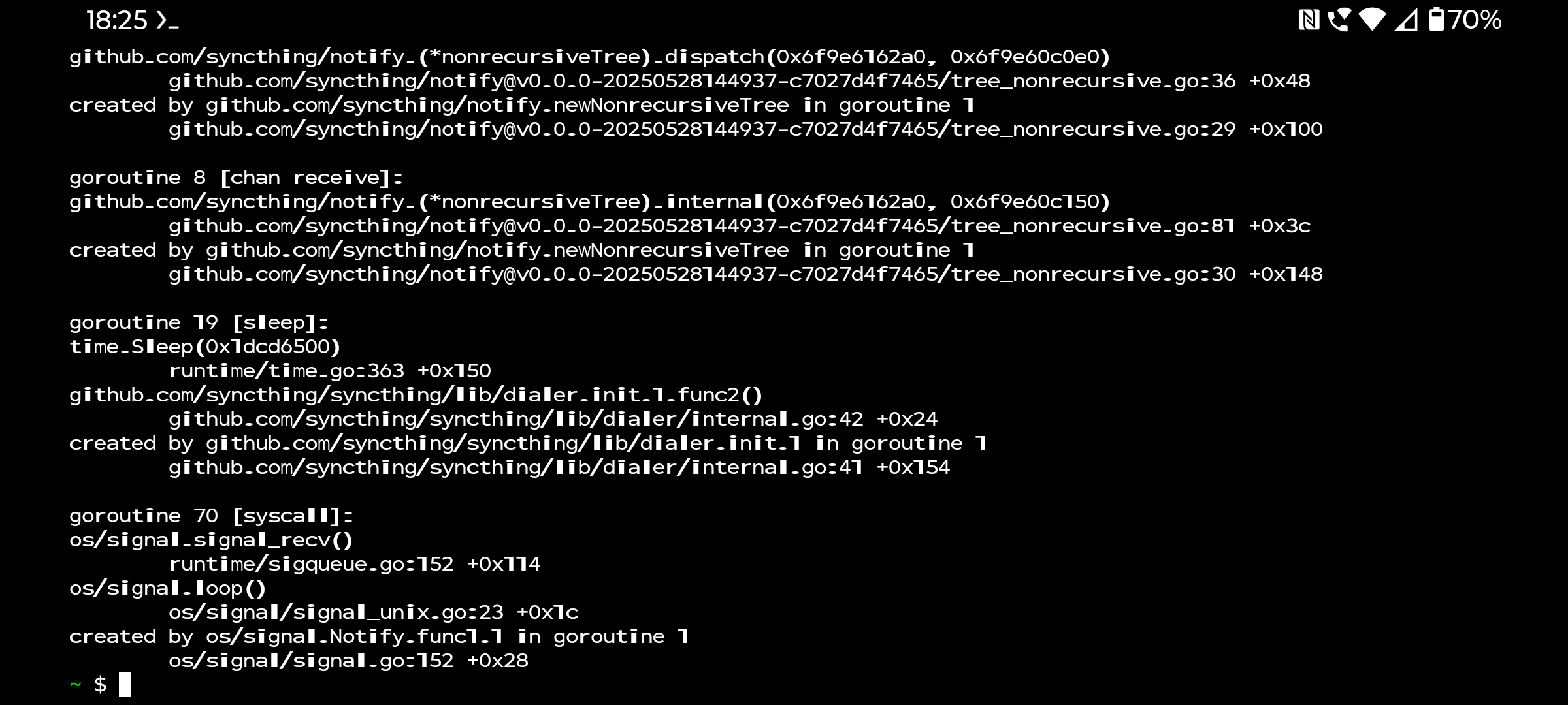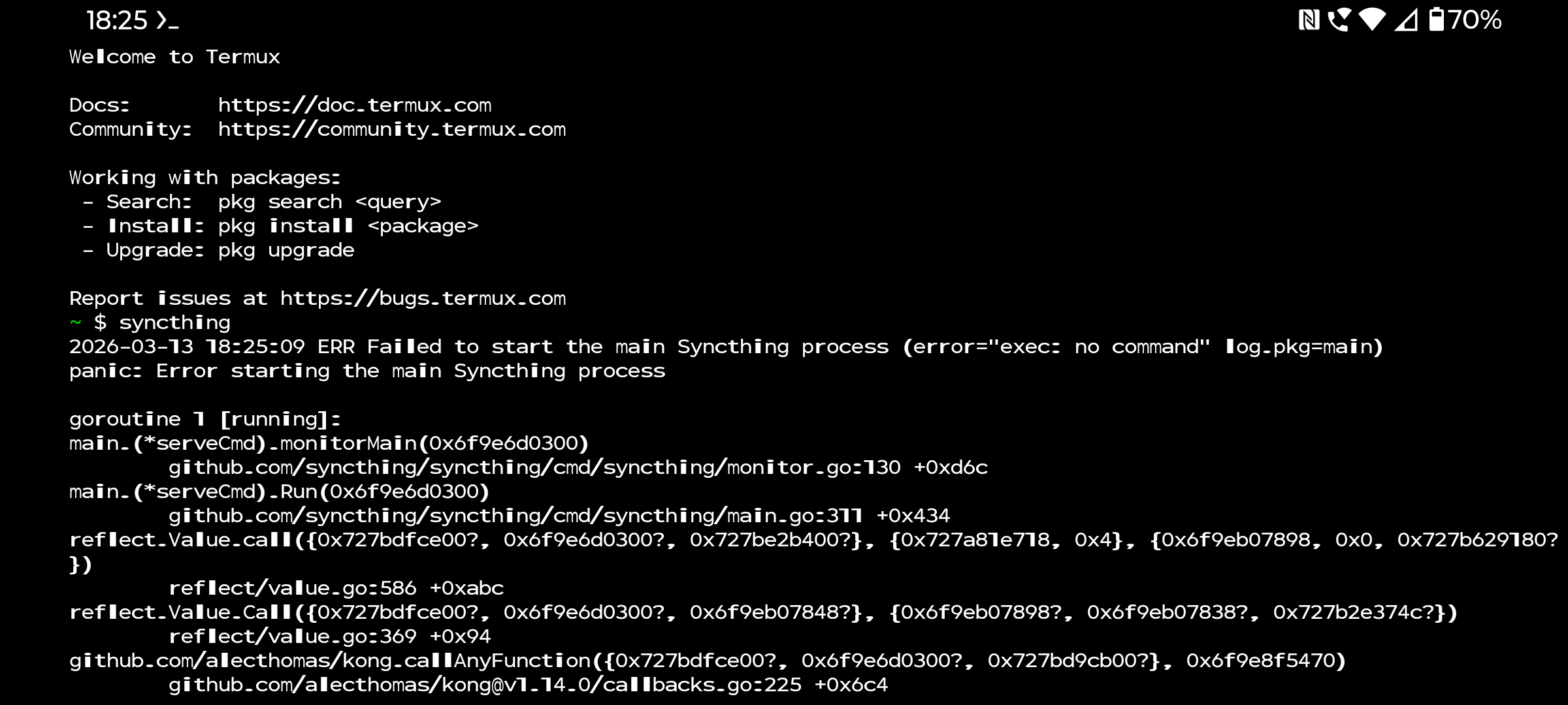 Earlier versions of Syncthing worked as expected in Termux, upgrading to 2.0.15 failed with errors indicating goruntime errors. (Changelog for 2.0.15 includes build with Go 1.26; use Go 1.25 features by @calmh in #10570. Could this be related? I have not been able to revert the Termux version to 2.0.14, any advice would helpful. This has also been reported on the Termux bug tracker. Termux version is googleplay.2026.02.11