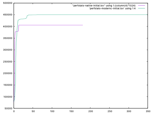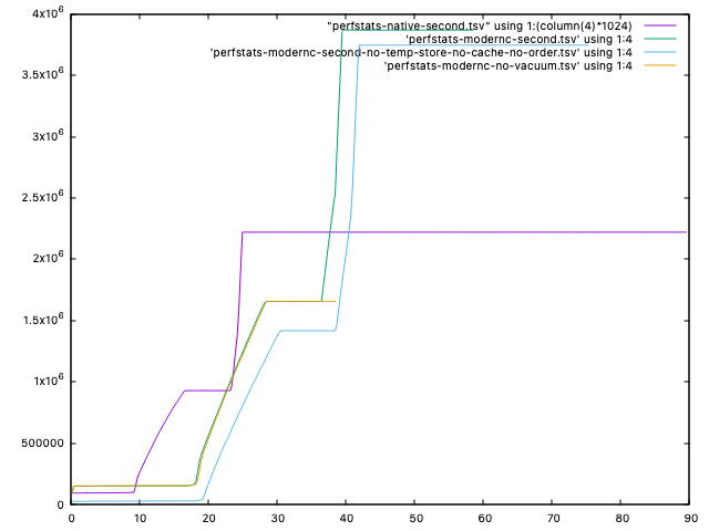 This is initial migration (i.e., 1.x to 2.0) using either stock 2.0.5 or 2.0.5 compiled without CGO, time on the X axis (seconds) and maximum resident set size in bytes on the Y axis. The native C version finished in about half the time compared to the modernc version and used slightly less memory, ~400 vs ~450 MB.
