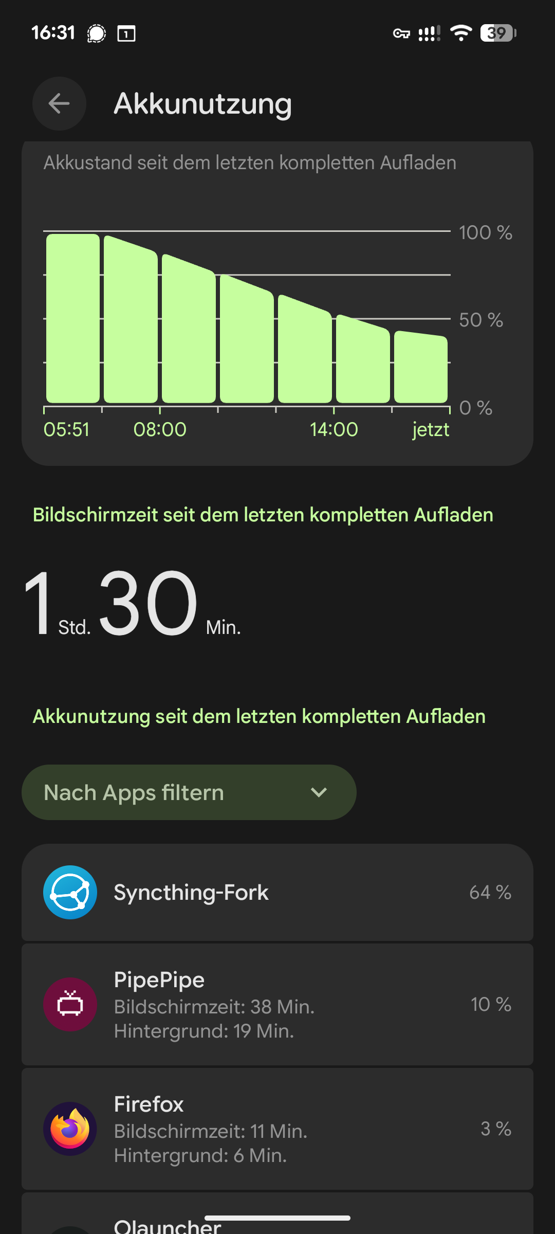 since I upgraded to syncthing v2 through Syncthing-Fork it uses loads of battery. It was getting marginally better with v2.0.10 over v2.0.9 but it still uses over 60 % (2.0.10 fix(syncthing): do not perform CPU benchmark on startup unless logging enabled by @pixelspark in #10398). With v1 syncthing was hardly even noticable compared to other services such as messenger apps e.g. Does someone else also see this behaviour?