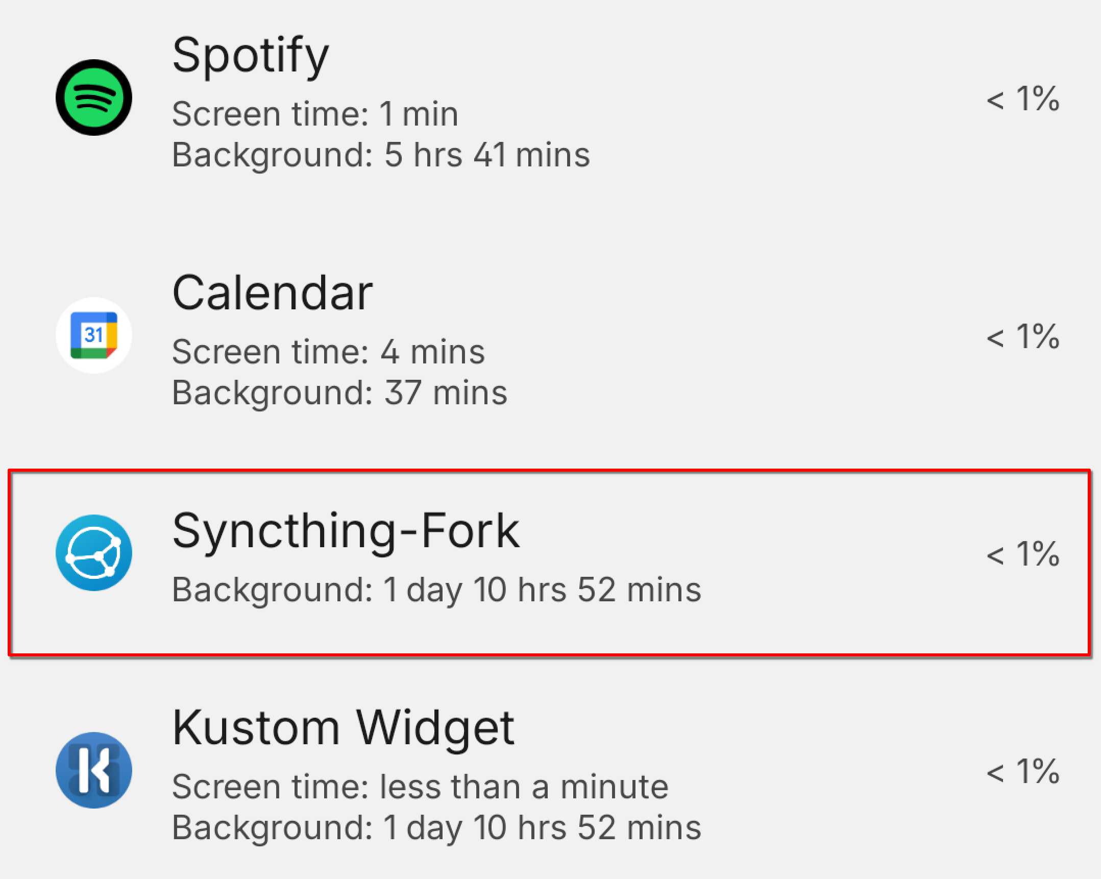 I was previously running Catfriend1’s Syncthing-fork (GitHub build) v1.29.6.4 and had no noticeable battery usage. I recently upgraded to 2.0.10.1 and it now routinely uses ~10% of the overall battery every 4 hours. When the phone is otherwise idle, it shows as 80-90% of the battery usage! (note, that’s relative to the battery used in each two-hour period)