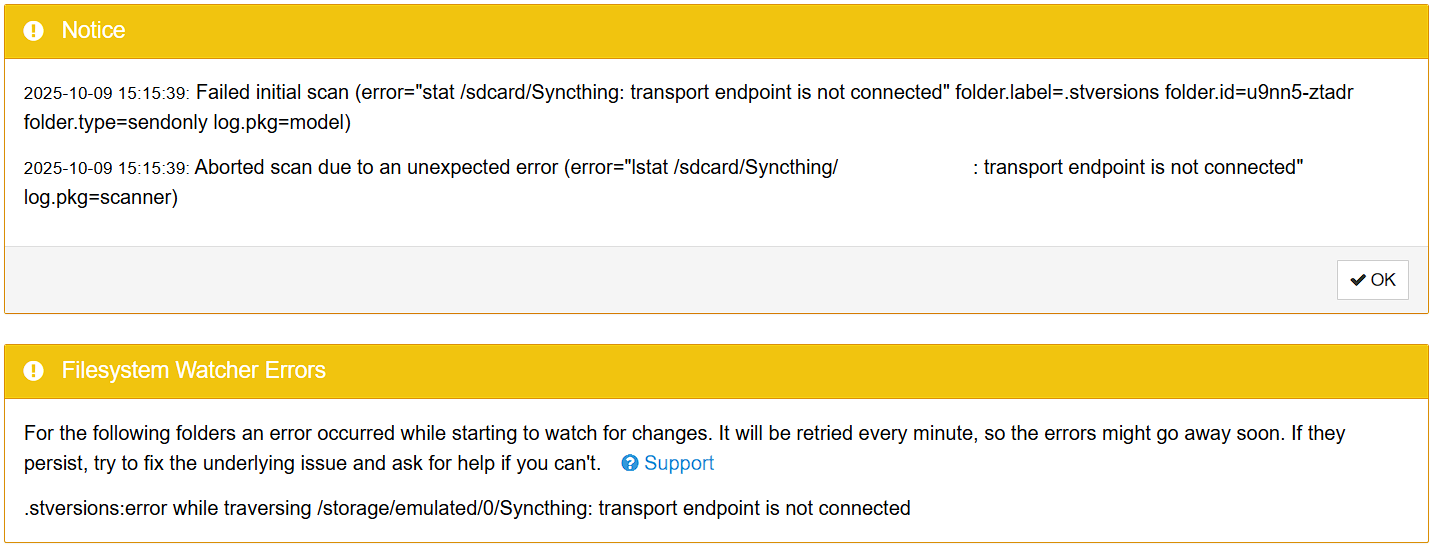 I also get a message Aborted scan due to an unexpected error: context canceledI’m getting the same error messages on just one Android device (Google Pixel 6a running GrapheneOS). I’ve had Syncthing running on Google Pixel 8 and Pixel 9 Pro Fold too (with both also running GrapheneOS), but the error isn’t present there.