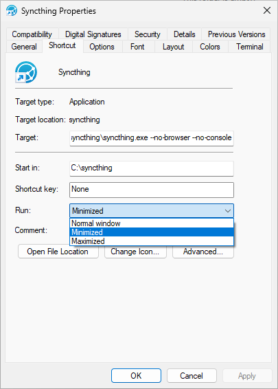 Windows Terminal does not completely replace the default PowerShell (even within Windows Terminal, Start-Process may invoke the legacy PowerShell). Using Start-Process in PowerShell correctly hides the command line window. Therefore, when creating a shortcut, you can first call PowerShell and then use PowerShell to create the Syncthing process.